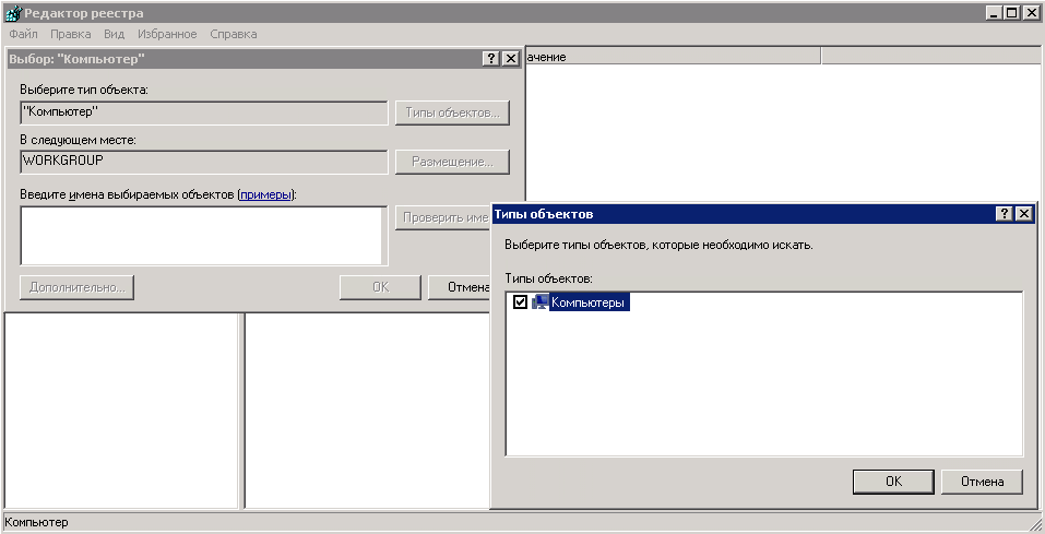 В диалоговом окне “Выберите компьютер“ щелкните “Типы объектов“, выберите объект поиска и нажмите кнопку ОК.