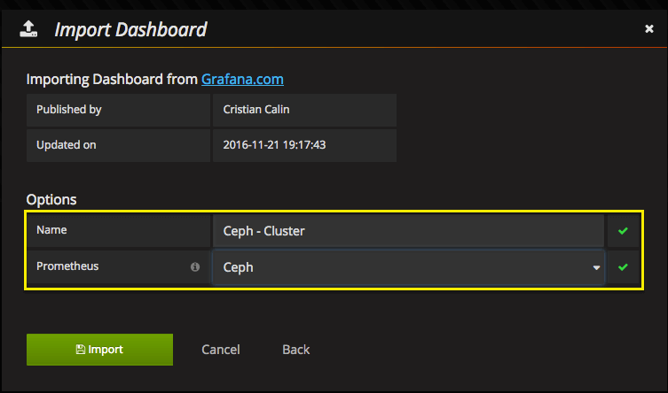 Затем добавляем дашборд. В данном примере используется Ceph - Cluster шаблон с Grafana Labs. Добавляем его. (Для удобства можно использовать ID 917 для быстрого импорта).