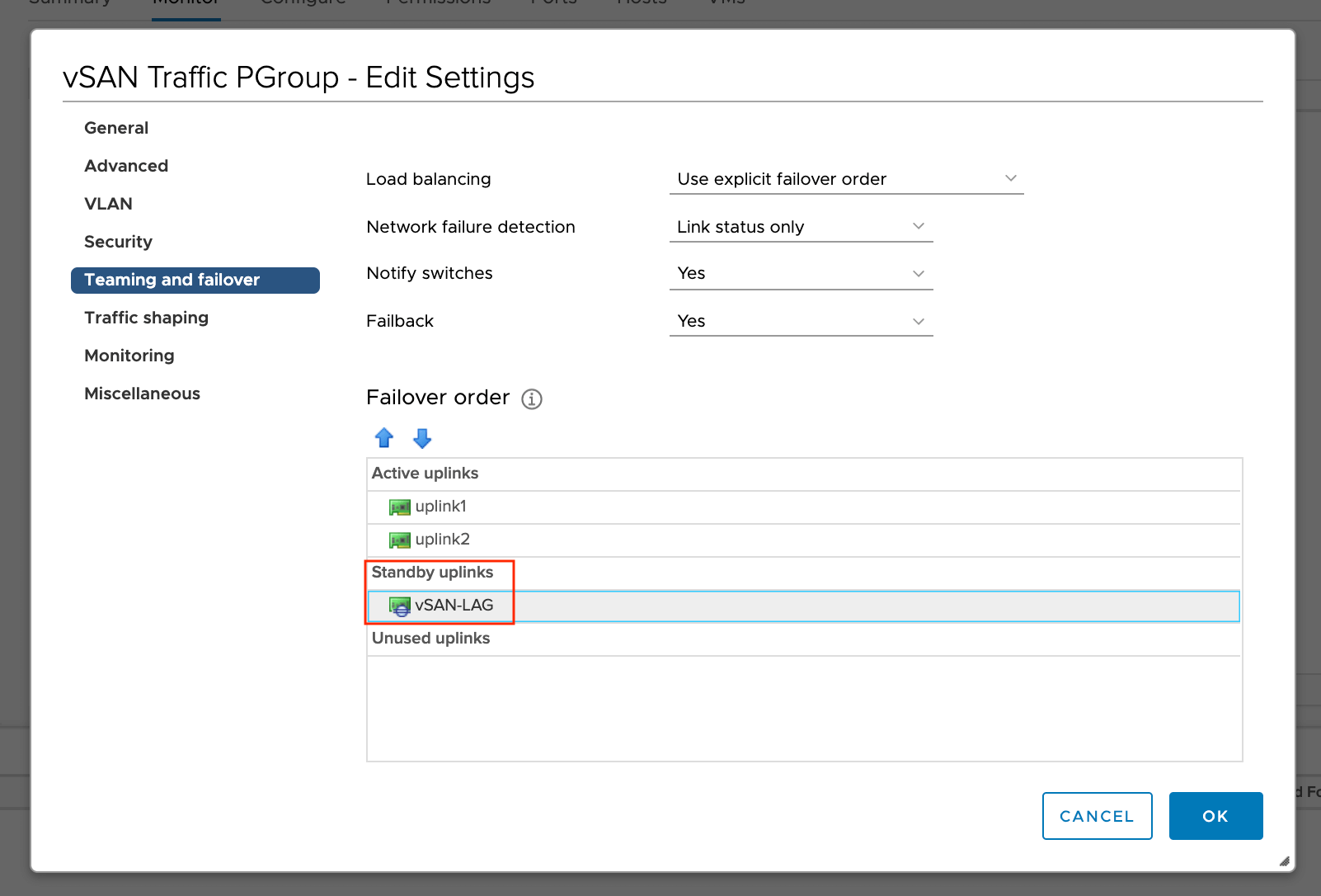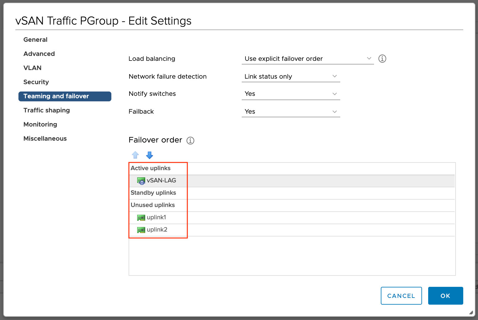 Обратите внимание, что когда LAG выбран, как основной аплинк, режим балансировки порт группы наследуется от режима балансировки, указанного в LAG, о чём нас дополнительно информируют.