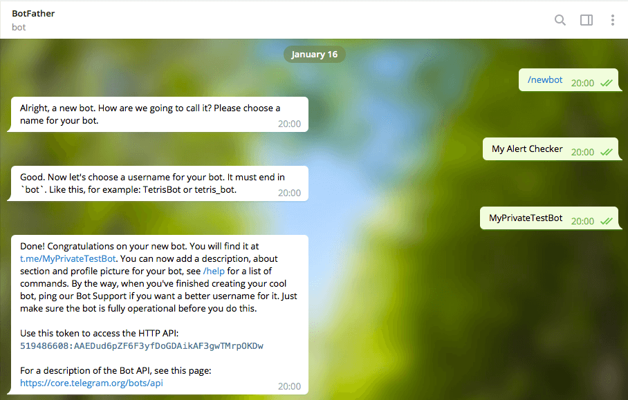 Добавляем бота под названием BotFather и отправляем ему команду /newbot, выбираем имя, которое будет отображаться в списке контактов и адрес. Например, «My Alert Checker» с адресом «MyPrivateBot».