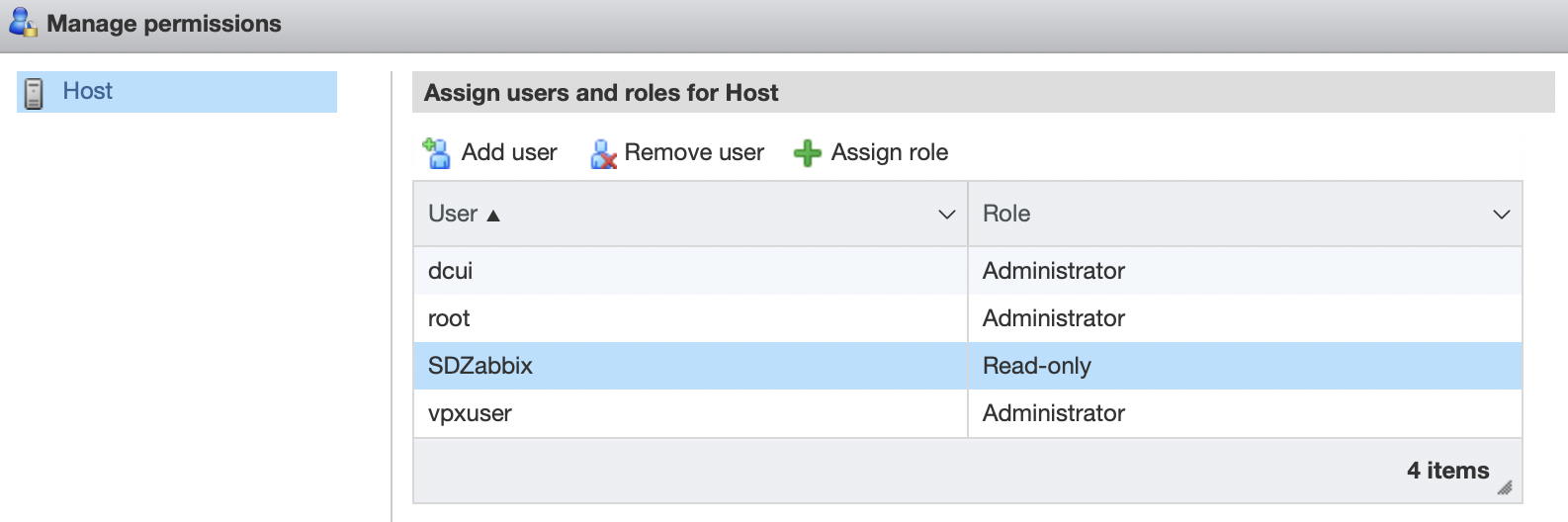 Zabbix отслеживает VMware с помощью службы API (SDK), поэтому обязательно создаём действительного пользователя в vCenter, которого может использовать на сервере Zabbix.